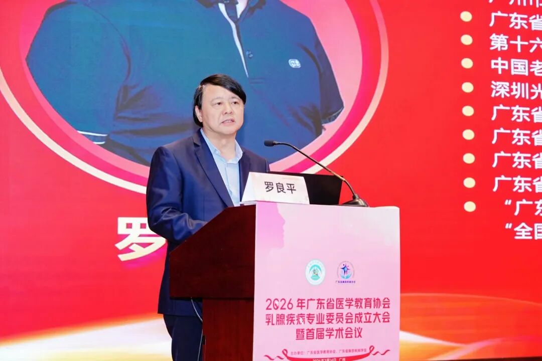 选举议程结束后,广东省医学教育协会罗良平会长致辞。对乳腺疾病专业委员会的成立及新当选的各位委员表示热烈祝贺,并对专委会未来工作提出殷切期望。他指出,当前我国乳腺疾病发病率持续升高且呈年轻化态势,严重威胁女性健康,加强规范化诊疗与科普教育意义重大。他强调,专委会要搭建高水平学术交流平台,推进诊疗技术规范创新,强化医学人才培养与健康科普工作。希望各位委员凝心聚力、履职尽责,不断提升我省乳腺疾病防治水平,为守护女性健康、助力健康广东建设贡献力量。