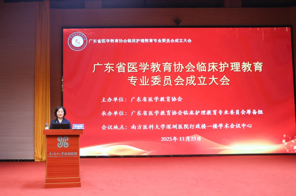 2025年11月23日,由广东省医学教育协会主办、南方医科大学深圳医院承办的广东省医学教育协会临床护理教育专业委员会成立大会暨第一届临床护理教育学术会议在南方医科大学深圳医院学术会议中心举行。粤港澳大湾区及省内各大医院百余位护理教育专家、临床教学骨干齐聚深圳,共同擘画区域护理教育创新发展新蓝图。成立大会由李海燕副会长兼秘书长主持。